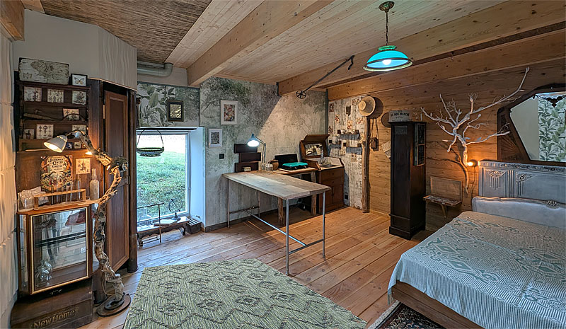 - L’Atelier du Vivant : Cette chambre est un prolongement de mon travail de sculpteur. Vous y vivrez parmi des œuvres en bois recyclé, au milieu d’un décor de cabinet de curiosités botanique, dans l’esprit des explorateurs du 19ème.